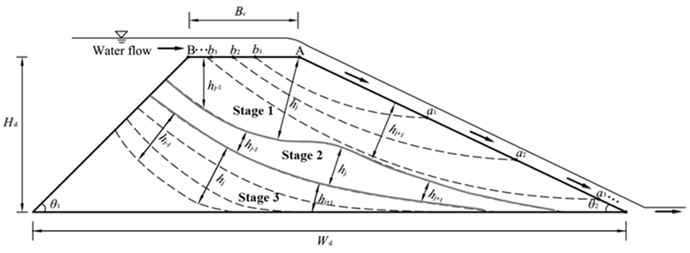 圖1. 堰塞壩沿流動方向的漫頂潰決模型