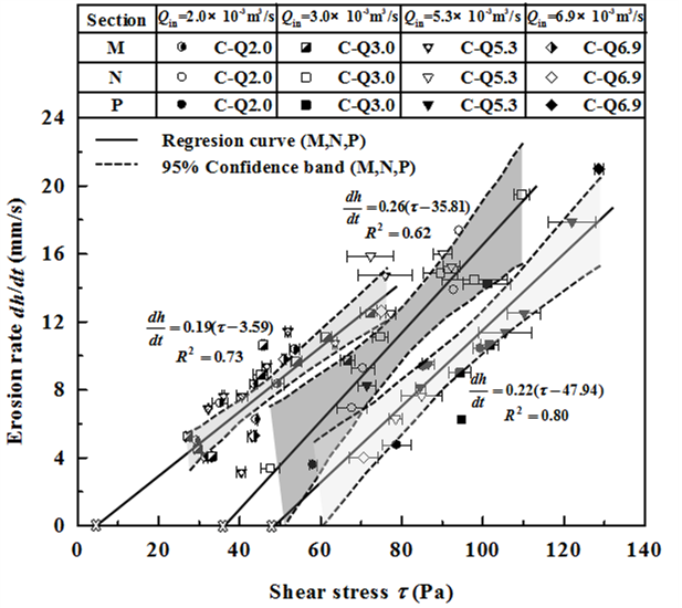 圖2. 堰塞壩漫頂潰決過程中不同截面處壩體侵蝕率與壩上水流侵蝕力的關(guān)系