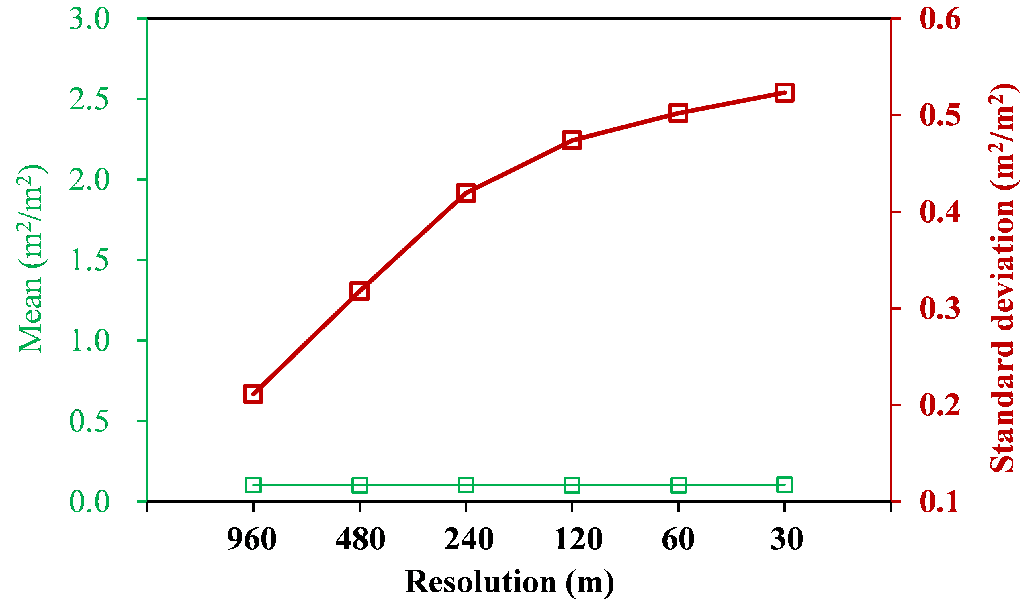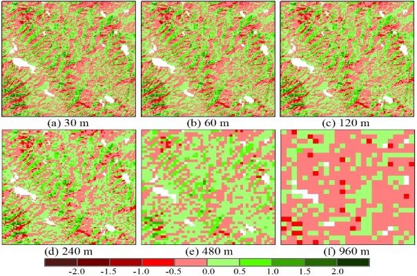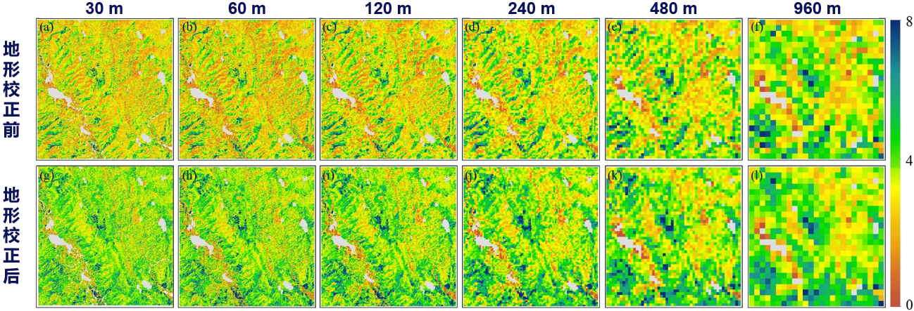 融合多源多尺度遙感數(shù)據(jù),借助集合多尺度濾波算法,兼顧不同分辨率遙感影像間的信息傳遞過(guò)程,構(gòu)建了復(fù)雜山地多尺度LAI遙感反演模型,生成了960 m、480 m、240 m、120 m、60 m和30 m尺度LAI數(shù)據(jù)集。研究發(fā)現(xiàn),隨著空間分辨率的增加,山地LAI空間紋理信息和變化過(guò)程逐漸豐富,且地形對(duì)LAI遙感反演的影響愈加顯著;消除地形對(duì)遙感信號(hào)的輻射畸變能夠顯著改善不同坡度條件LAI反演精度,極大提升了多尺度LAI估算結(jié)果的空間一致性及表達(dá)能力。