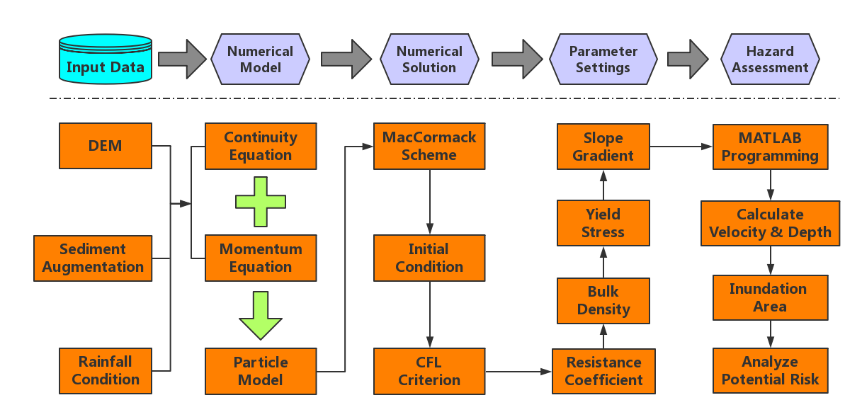 研究團(tuán)隊(duì)結(jié)合實(shí)地考察與遙感解譯技術(shù),在九寨溝流域內(nèi)發(fā)現(xiàn)83處地震誘發(fā)的崩滑體,主要集中在距震源斷層3 km的范圍內(nèi)。調(diào)查發(fā)現(xiàn)流域內(nèi)扎如溝、荷葉溝、樹(shù)正溝、則查洼溝、以及下季節(jié)海子溝泥沙增量較大,震后發(fā)生泥石流的可能性最高。后期通過(guò)多期高清遙感影像和無(wú)人機(jī)相片,解譯獲取地震前后五條泥石流溝的泥沙增量。由此,結(jié)合泥沙增量、流團(tuán)模型、以及數(shù)值模擬手段開(kāi)發(fā)一套完善的泥石流災(zāi)害評(píng)估方法,并通過(guò)震后下季節(jié)海子溝泥石流事件驗(yàn)證了方法的可行性。利用新方法,評(píng)估了上述五條泥石流溝的規(guī)模、沖出距離、堆積范圍、堆積深度等泥石流關(guān)鍵特征參數(shù),并制作泥石流危險(xiǎn)分區(qū)圖,為震后九寨溝景區(qū)土地利用規(guī)劃、泥石流次生災(zāi)害防治等提供參考依據(jù)。