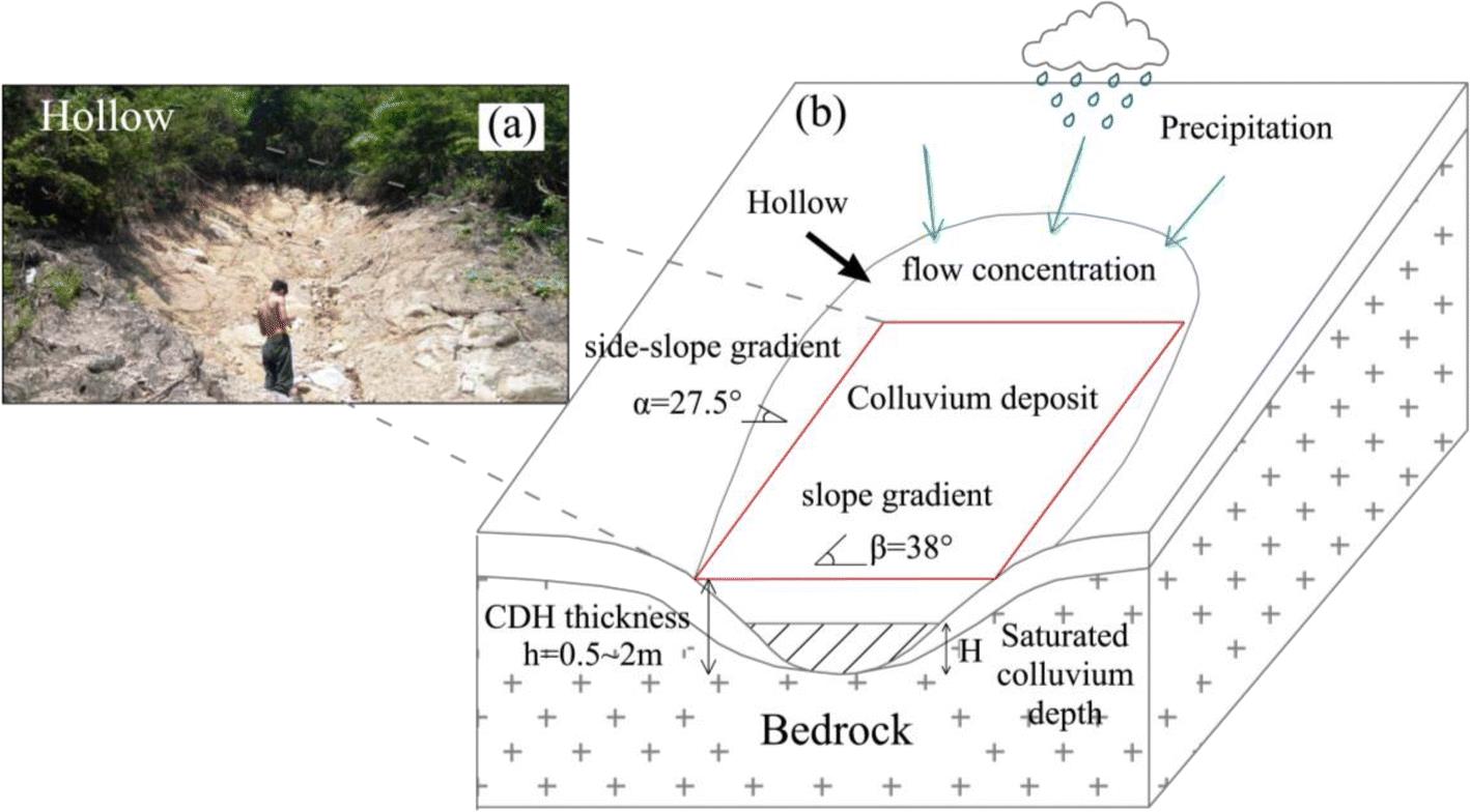 研究發(fā)現(xiàn),這類低頻泥石流是源區(qū)凹槽土體在極端降雨情況下失穩(wěn)起動(dòng)形成的。凹槽后端的匯流面積與凹槽土體的堆積坡度和厚度對(duì)其穩(wěn)定性影響顯著,當(dāng)坡度和厚度分別超過30.5°和1.25 m的臨界值時(shí),土體將失穩(wěn)破壞。源區(qū)凹槽的存在增加會(huì)提供四倍于正常數(shù)量的地表徑流量。
