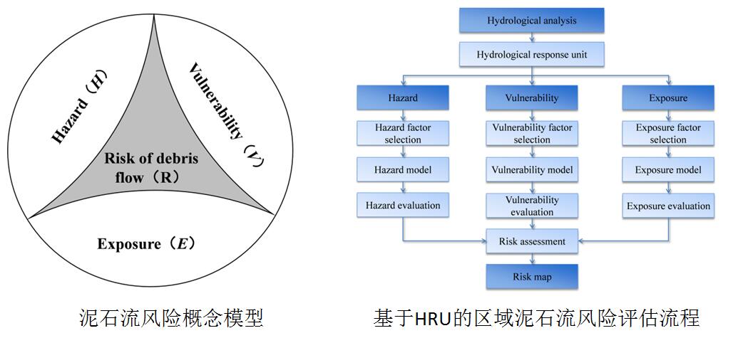 災害風險研究是當前國際減災領域的研究熱點與難點。此前在區(qū)域泥石流風險評價過程中,較少考慮承災體的暴露性,同時區(qū)域尺度的災害評價單元多采用網格單元、均質單元或行政單元,不能有效反映基本水文過程的綜合地貌完整性,對區(qū)內孕災條件的體現(xiàn)也不明顯。近期,鄒強副研究員、崔鵬研究員、雷雨博士等針對上述不足,開展了區(qū)域泥石流災害風險評估的系統(tǒng)研究并取得了重要進展。